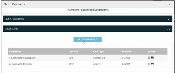 Under Saved Cards, clients can add a card by clicking "Save New Card" and entering their details.