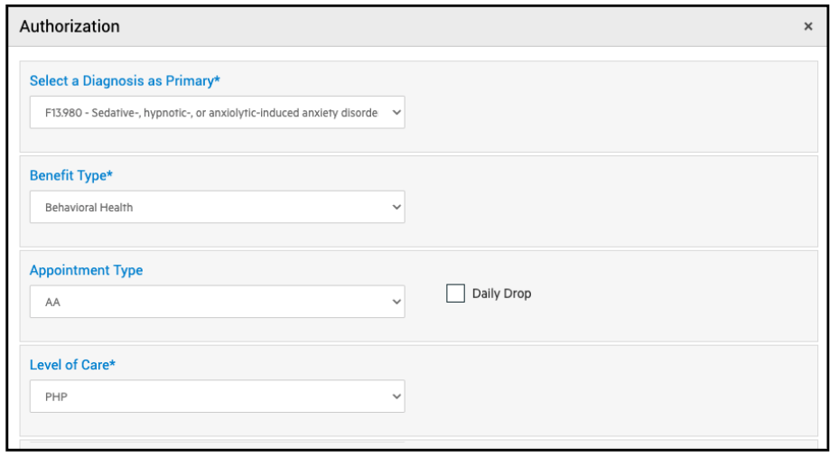 Enhanced Authorization Details –– Authorizations now support more detailed data entry. You can select a primary diagnosis specific to each authorization (independent of the chart’s primary diagnosis), choose a Benefit Type (Behavioral Health or Medical Health), and, optionally, specify an applicable appointment types. If the authorization applies to daily services rather than sessions, you can select Daily Drop. These updates will support carved-out insurance benefits and upcoming Alleva Billing enhancements.