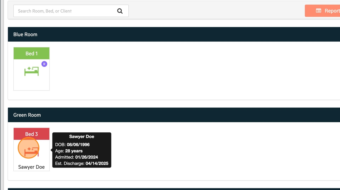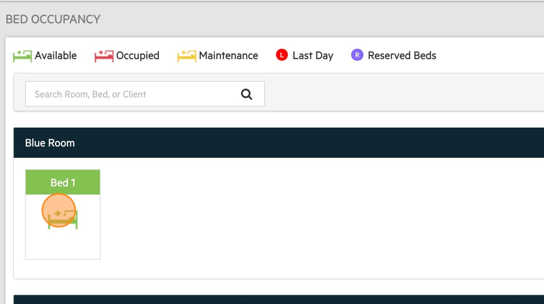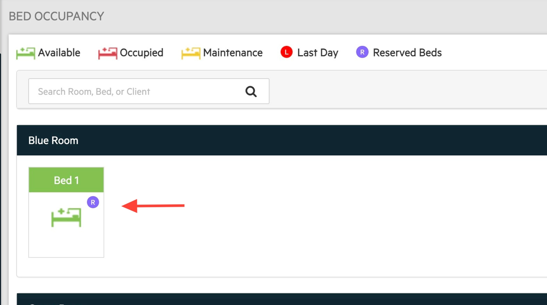4. A purple "R" will appear in the box next to the current occupying client. This signifies the reserved bed.