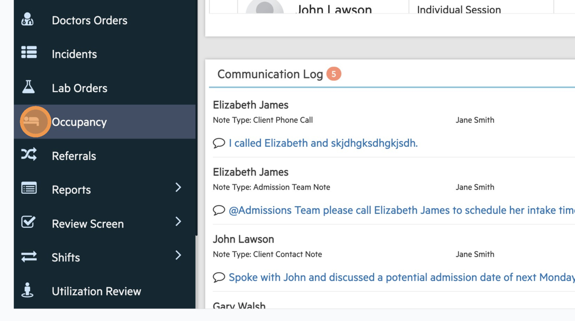 1. To reserve a bed for a prospective client select the "Occupancy" tab in the navigational menu.